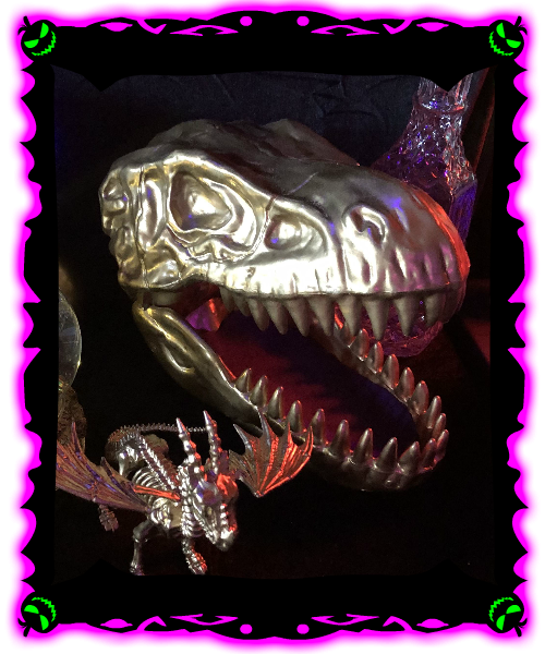 | One of the prized relics of the Spookeasy is the Golden T-Rex. It is literally priceless, or it was bought at the store and spraypainted gold. We're not going to say which it is, rather we expet you to marvel at is glory. We just hope a headless Golden T-Rex comes looking for its skull, cuz that'd be really awkward. |